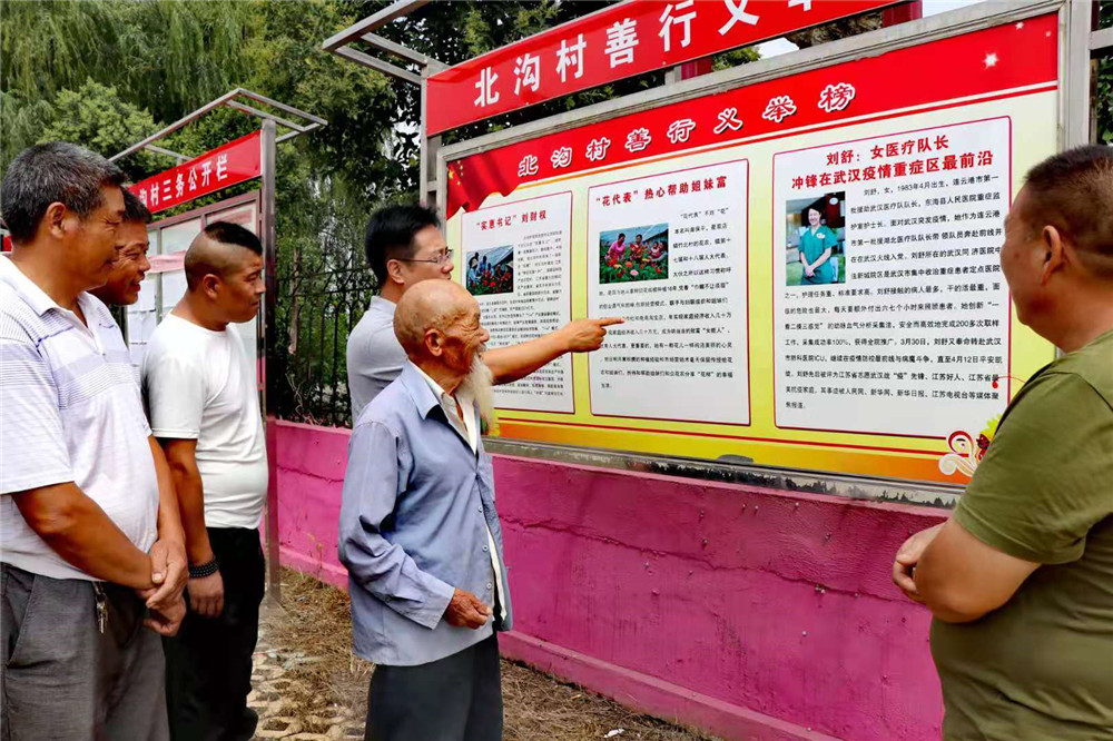 北沟村通过在村头巷尾设立“好人榜”、开设“道德讲堂”、刷新群众喜闻乐见的文化墙、开展党员志愿活动和定期评选“致富之星”“好儿子”“好儿媳”“好邻居”等一系列有效的活动载体,在全村上下形成崇尚“家庭和睦、邻里和谐、干群融洽”的和谐发展氛围,树立崇德向善、扶危济困、扶弱助疾的模范典型,引导群众见贤思齐,让村风民风焕然一新。