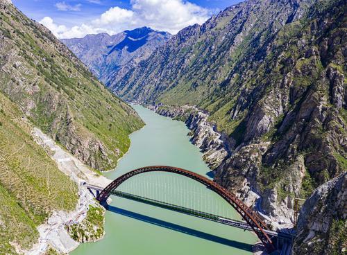▲试运行的复兴号列车行驶在藏木特大桥(6月17日摄,无人机照片)。