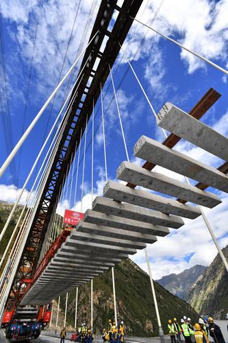 ▲中铁十一局工程技术人员在拉林铁路藏木特大桥上铺轨(2020年9月20日摄)。