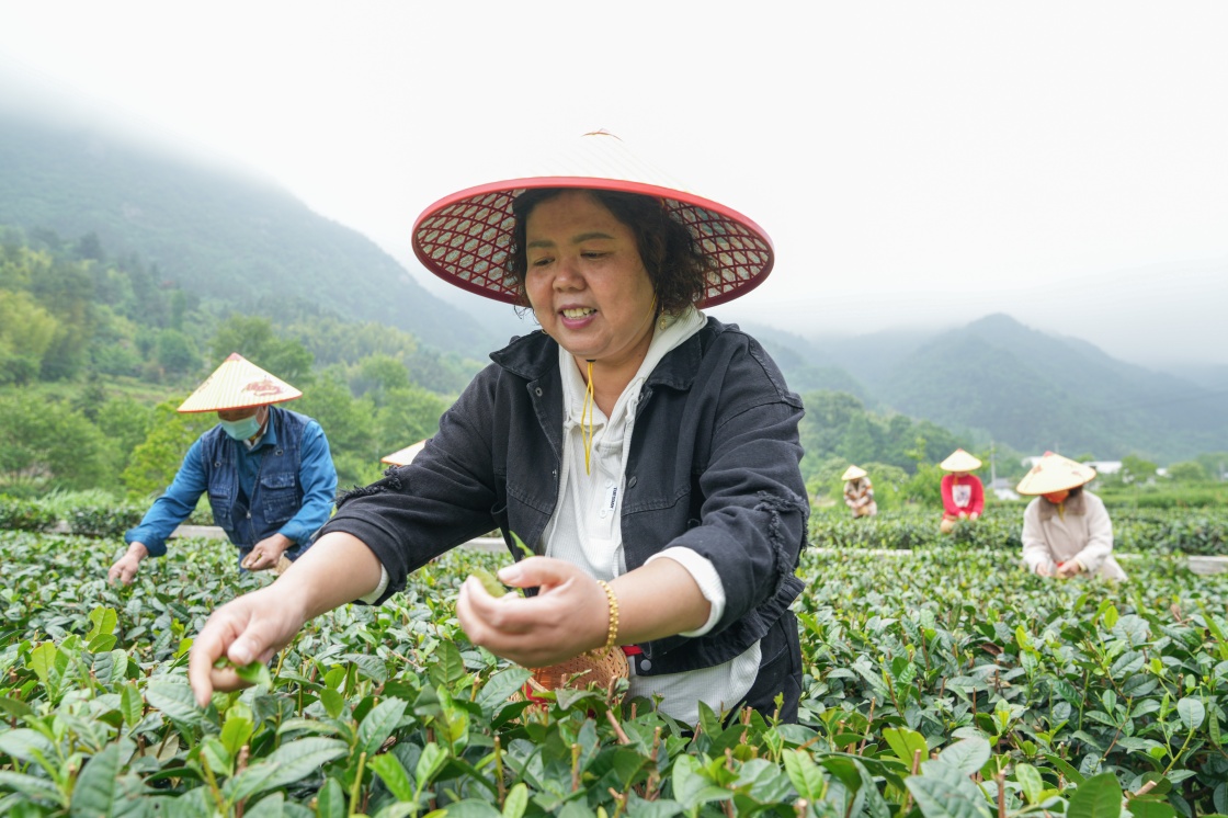 5月11日,村民在安徽省金寨县花石乡大湾村生态茶园内采摘茶叶。新华社记者 杜宇 摄