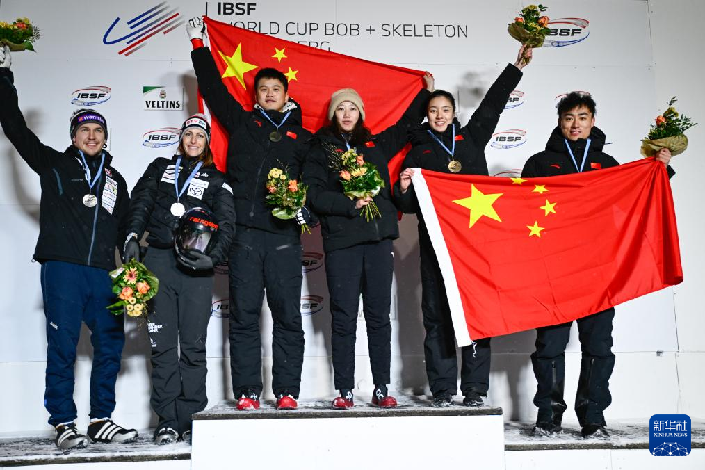 1月3日,冠军中国组合赵丹(右三)/林勤炜(左三)、亚军奥地利组合弗洛克(左二)/迈克尔(左一)和季军中国组合黎禹汐(右二)/殷正在颁奖仪式上。新华社发(国际雪车联合会供图)