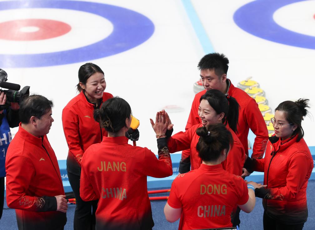 2月13日,中国冰壶队教练和选手在比赛间隙相互鼓励。新华社记者 胡星宇 摄