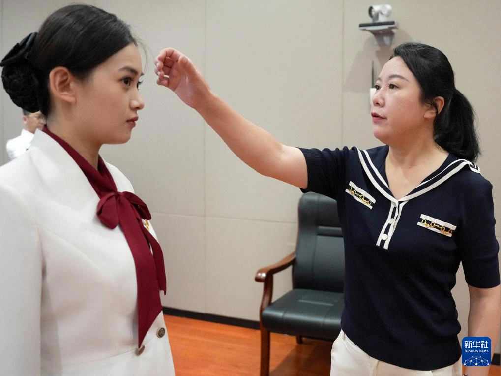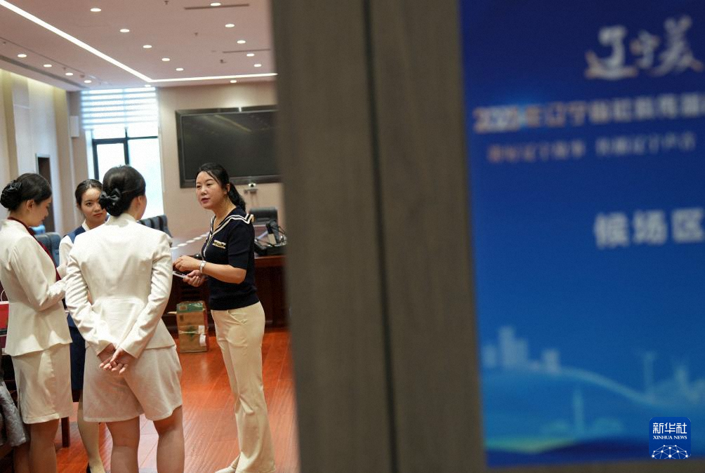 7月22日,在沈阳市大东区新时代文明实践中心,石任华(右)在后台帮助同事整理着装和仪容。新华社记者 李钢 摄