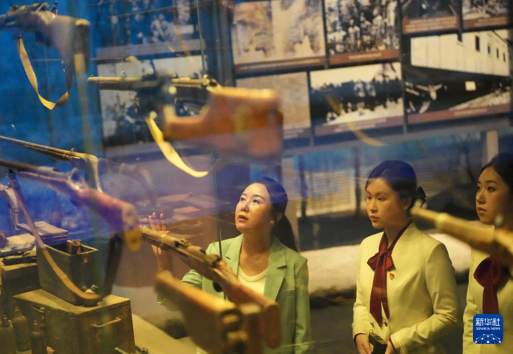 7月28日,在“九一八”历史博物馆,石任华(左一)和同事查看抗战文物。新华社记者 李钢 摄