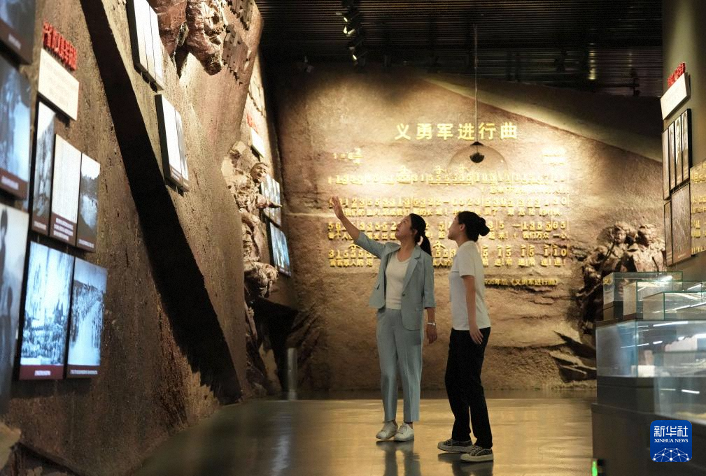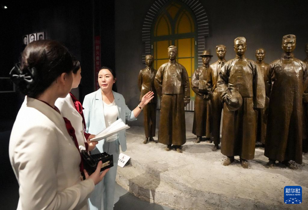 7月28日,在“九一八”历史博物馆,石任华(左)和同事交流展陈和讲解融合技巧。新华社记者 李钢 摄