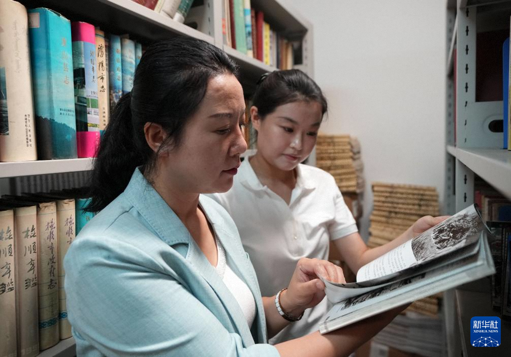 7月28日,在“九一八”历史博物馆,石任华(左)和同事查阅资料,充实讲解内容。新华社记者 李钢 摄