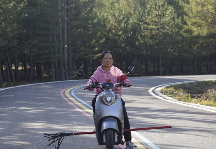 右玉县护林员许仙兰骑着电动车巡查防火情况(2025年10月14日摄)。新华社发(裴元新 摄)