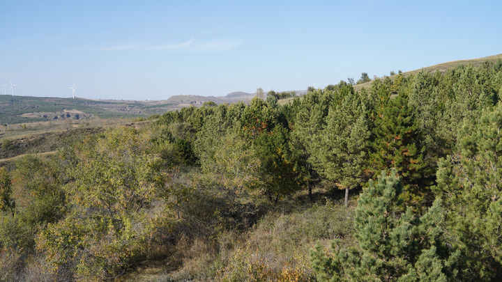 山西右玉,蒙古高原通向中原的咽喉孔道,西伯利亚寒流南下的天然风口,也曾是毛乌素沙漠风沙肆虐的前沿地带,如今却是层林葱茏中点缀着红黄,书写丰收的喜悦。