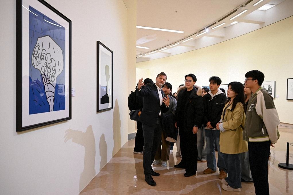 10月19日,在今日丝绸之路国际美术邀请展上,参展嘉宾(左一)为参观者讲解艺术作品。新华社记者 邹竞一 摄