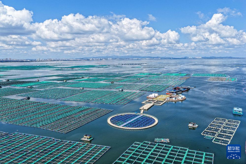 山东省荣成市桑沟湾海洋牧场生态网箱养殖区(9月13日摄,无人机照片)。新华社发(李信君 摄)