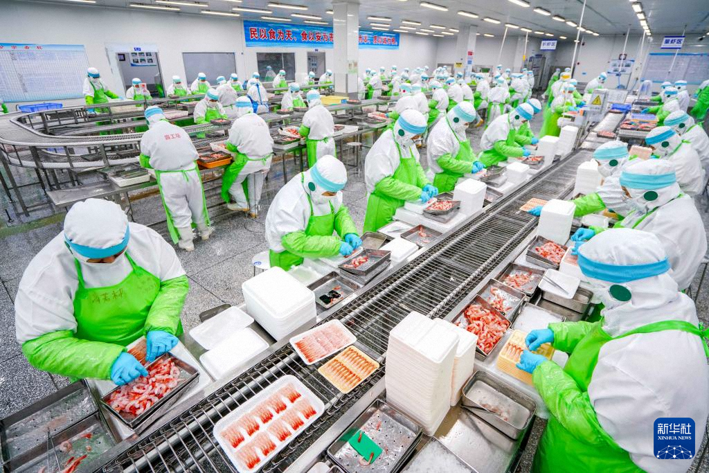11月10日,山东日照美佳集团的工作人员将甜虾产品装盘。新华社发(王敬之 摄)