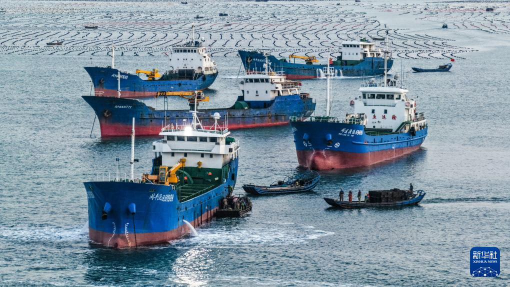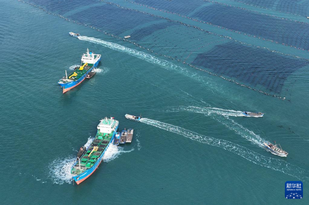 11月11日,在山东省荣成市爱伦湾海洋牧场,运鲜船在装运鲍鱼南下福建越冬(无人机照片)。新华社发(王福东 摄)