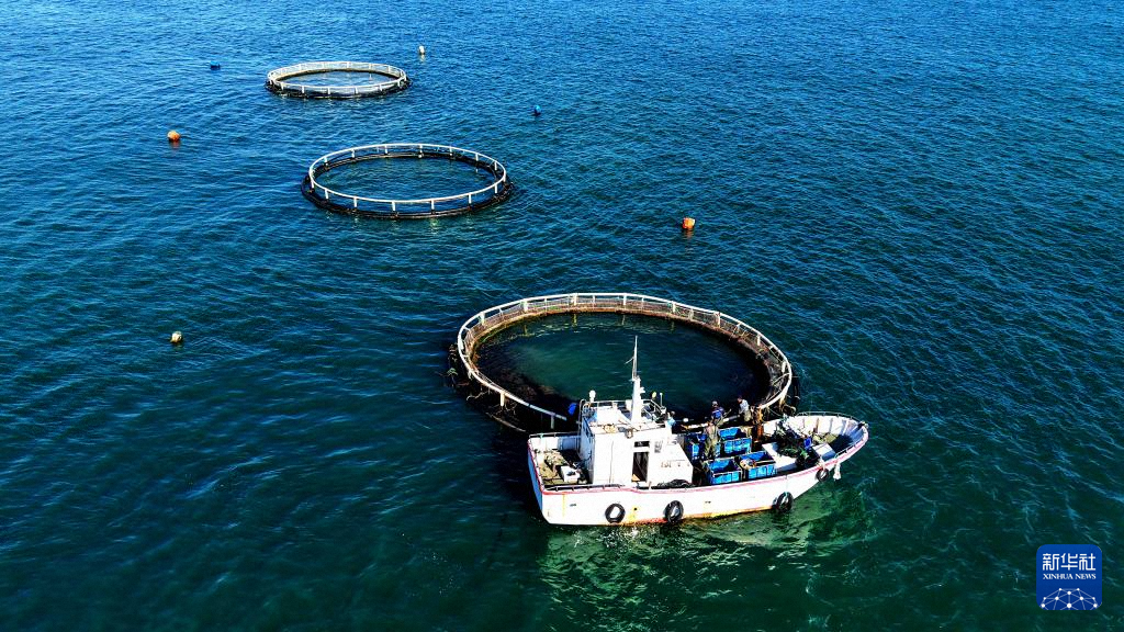 11月10日,在山东青岛西海岸新区鲁海丰海洋牧场,养殖船在管护网箱(无人机照片)。新华社发(俞方平 摄)
