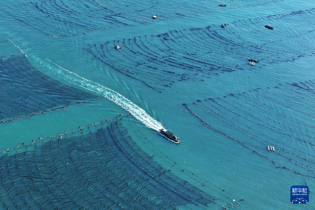 11月10日,在山东省荣成市桑沟湾海洋牧场,养殖工人在养殖区穿梭作业(无人机照片)。新华社发(王福东 摄)