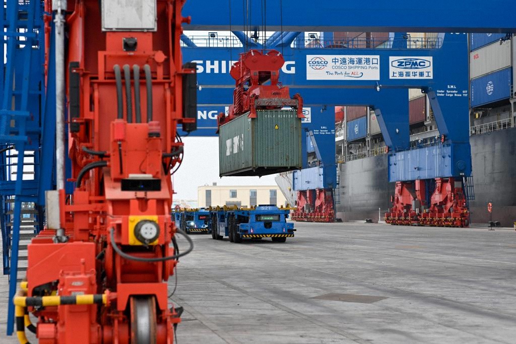 2024年11月14日,在秘鲁首都利马以北的钱凯港,岸边智能化设备吊装集装箱。当天,中秘共建“一带一路”重点项目钱凯港开港。新华社记者李梦馨摄