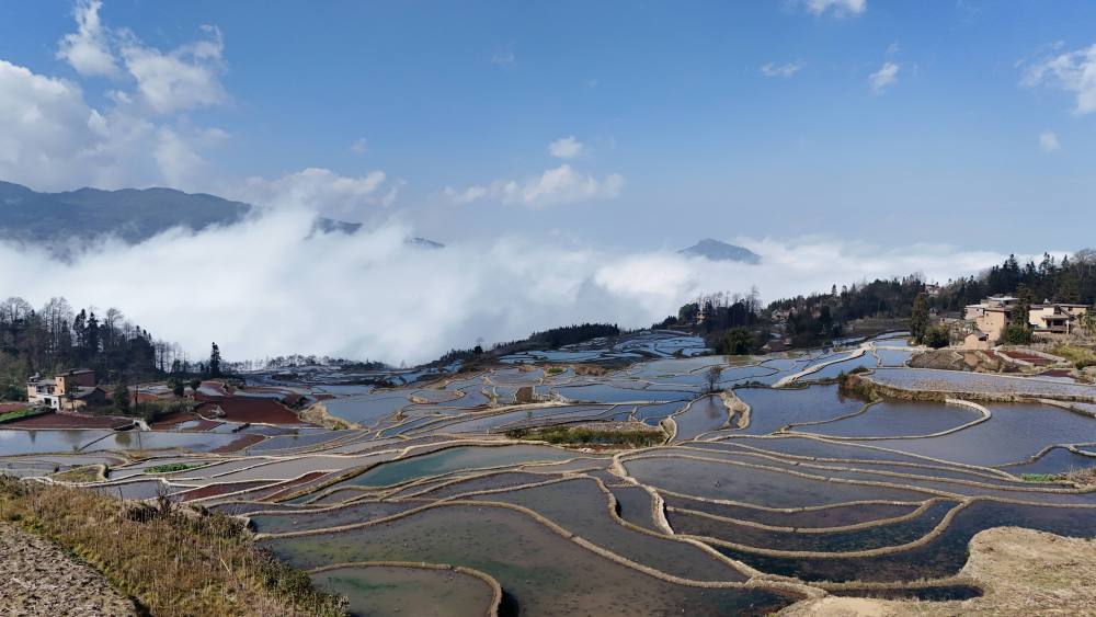 在云南红河州元阳哈尼梯田,层层梯田宛如明镜,当地人遵循“冬春注水养田”传统,通过层级沟渠为梯田蓄满山泉水。