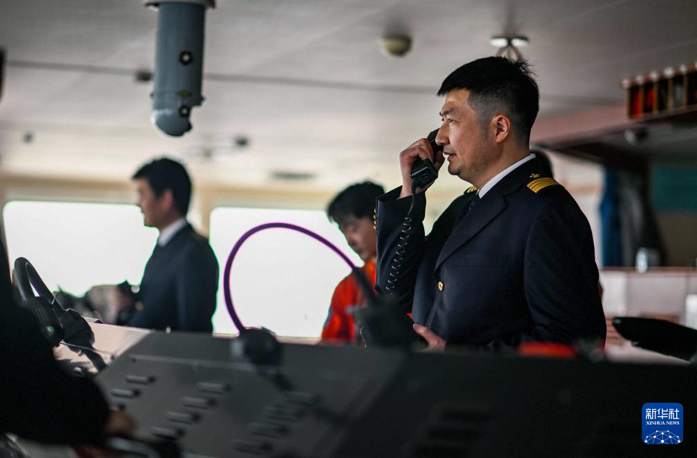 2月4日,天津港引航中心引航员孙勃在“中远海法”轮上指挥货轮进行离泊作业。新华社记者 赵子硕 摄