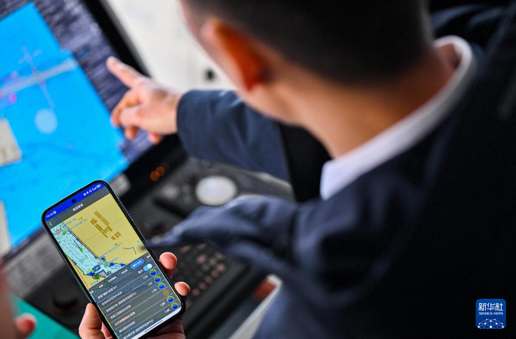 2月4日,天津港引航中心引航员许钦平在“中远海法”轮上通过手机查看船舶动态。新华社记者 赵子硕 摄