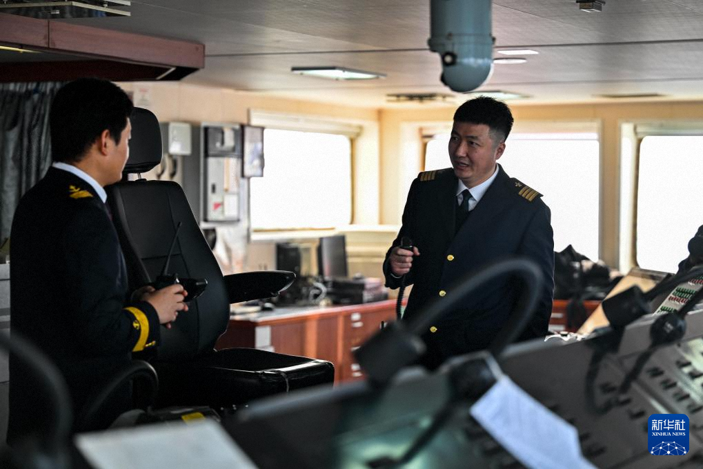 2月4日,天津港引航中心引航员孙勃(右)在“中远海法”轮驾驶室和船长沟通。新华社记者 赵子硕 摄