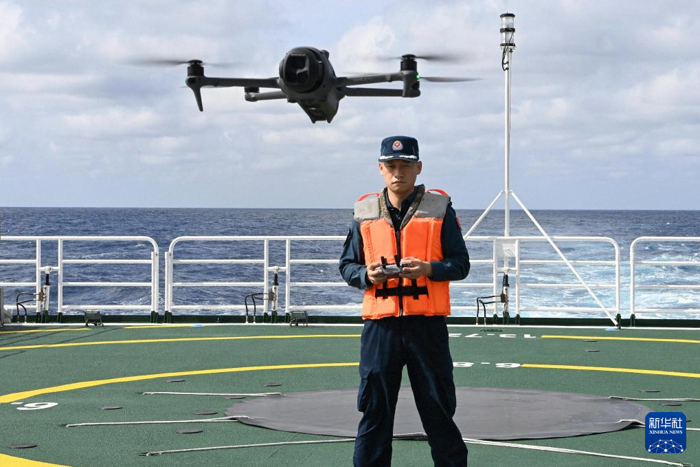 2月11日,中国海警万山舰执法员邱灿辉在舰艇航行时操控无人机。新华社发(翟一凡摄)