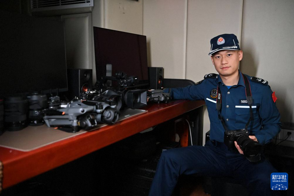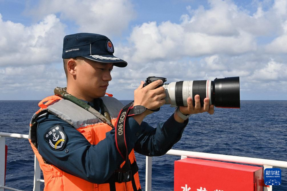 2月11日,中国海警万山舰执法员邱灿辉在进行维权取证训练。新华社发(翟一凡摄)