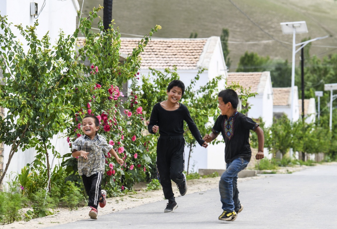 在新疆特克斯县境内的牧民定居点,小朋友在巷道内追逐玩耍(7月6日摄)。