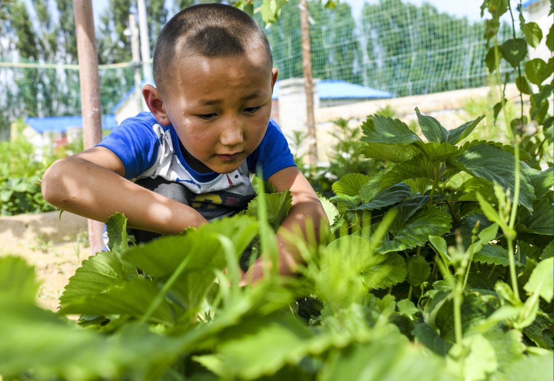 在新疆特克斯县境内的牧民定居点,一名小朋友帮家人采摘自家种植的水果(7月6日摄)。