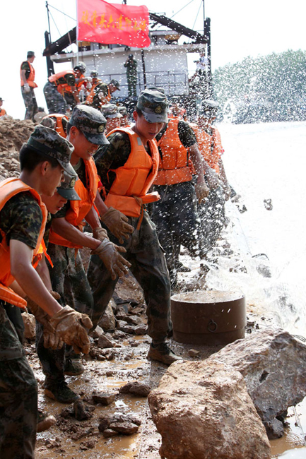 2010年7月,江西长江九江段、鄱阳湖区、昌江纷纷超警戒水位。面对严峻险情,1998年抗洪抢险中曾创下用血肉之躯封堵九江大堤决口奇迹的南京军区“硬骨头六连”所在师3800名官兵,从7月16日接到命令千里机动奔赴灾区一线,到22日已经连续7个昼夜鏖战九江,处置了一处处险情……新华社记者周科摄(资料图)