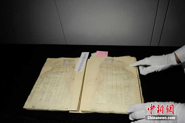 吉林省档案馆工作人员在展示馆藏的日本侵华档案。 张瑶