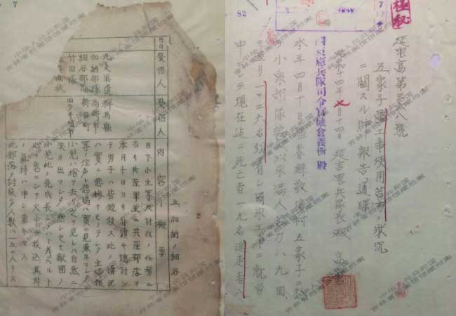 左图是1944年《邮政检阅月报(二月)》中的一份文件,文件记载了日军在扫荡一个村落时,所有男子被杀,小孩被扔进火中,共有150人遇害。右图是1939年延吉宪兵队《关于五家子军事工程施工中劳工使用状况的报告(通牒)》的一份文件,该文件记载了在珲春县敬信村地区,前后9次共有1026名东北劳工来这里参加军事施工。 林宏