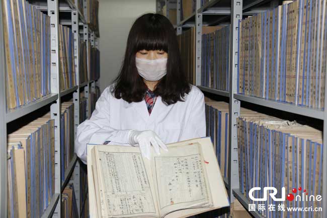 工作人员向记者展示馆藏日军侵华档案原件。 黎萌