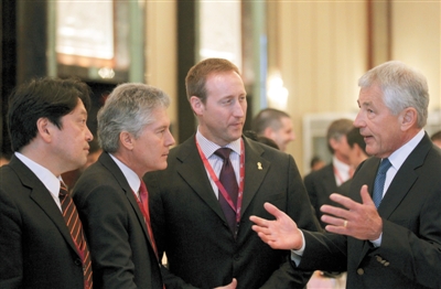 资料图:2013年5月31日,香格里拉对话会场。美防长哈格尔(右一)与日本防卫大臣(左一)、澳大利亚防长(左二)和加拿大防长(右二)交谈。