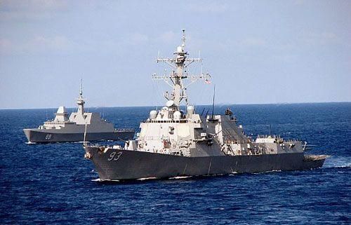 资料图:美国与新加坡海军在南海海域举行联合演习
