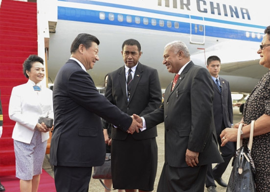 11月21日,国家主席习近平抵达楠迪,斐济总理姆拜尼马拉马夫妇在舷梯旁迎接习近平和夫人彭丽媛。(摄影 李学仁)