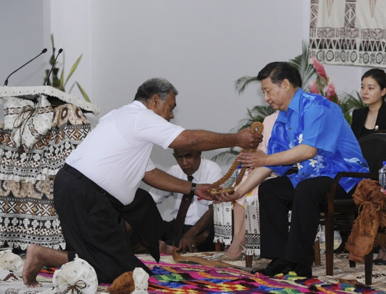 11月21日,国家主席习近平在楠迪出席斐济总理姆拜尼马拉马举行的传统欢迎仪式。这是在欢迎仪式上,斐济原住民按照传统习俗,向习近平献上寓意着平安吉祥的鲸鱼牙。(摄影 饶爱民)