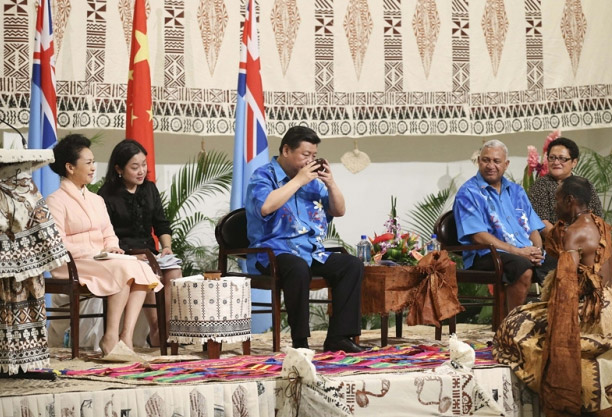 11月21日,在欢迎仪式上,斐济原住民向习近平敬献洋格纳树根制成的卡瓦汁,习近平慢饮而尽。(摄影 姚大伟)