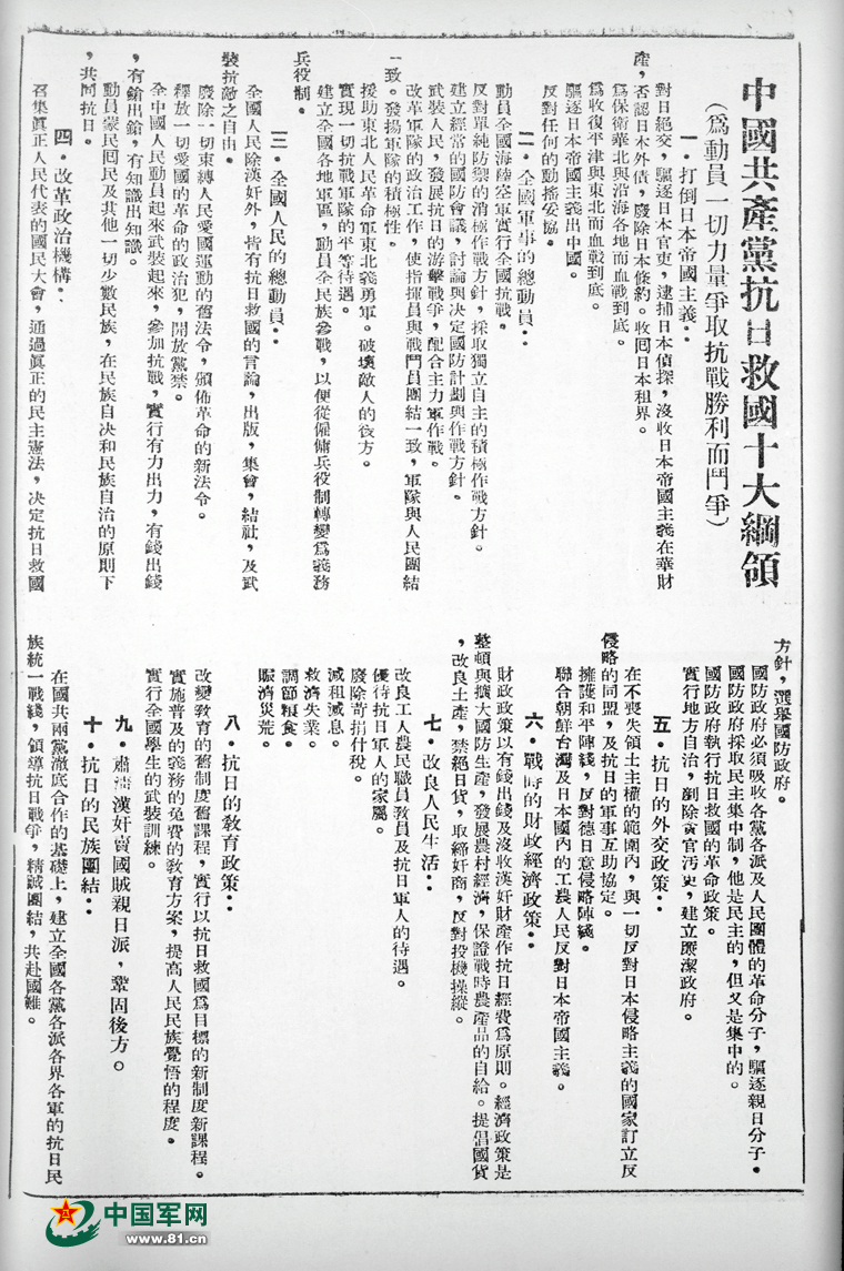 洛川会议通过的《抗日救国十大纲领》