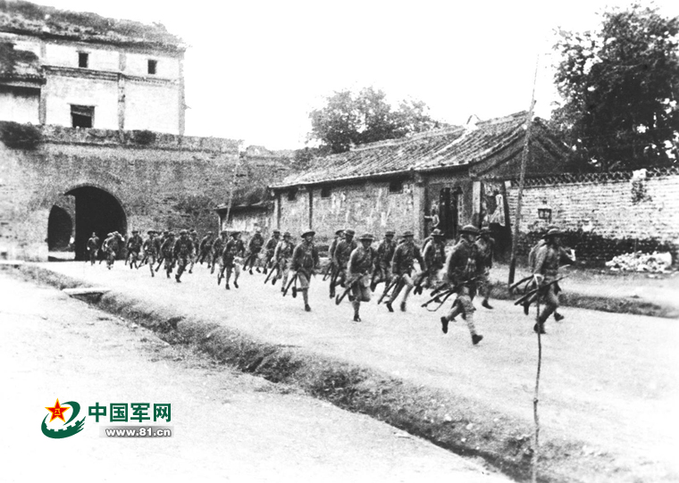 在卢沟桥进行军事演习的日军以一名士兵失踪为借口,要求进入宛平县城搜查,被中国驻军严词拒绝,日军随即向宛平城和卢沟桥发动进攻。图为驻守北平宛平城的中国军队奔赴卢沟桥抵抗日军。