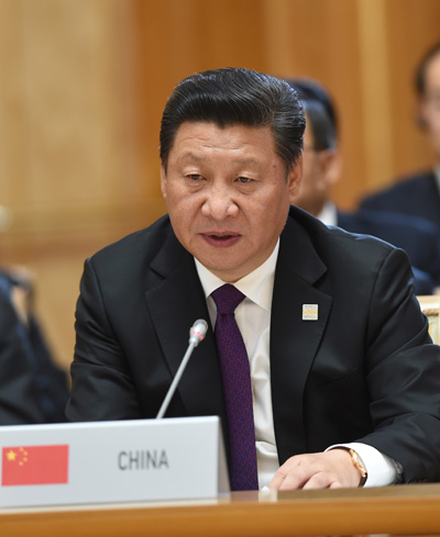 在讨论金砖国家合作议题时,习近平指出,各方要落实金砖国家新开发银行和应急储备安排等重大成果倡议,彰显金砖国家执行力。要规划重点合作领域,加强金砖国家经济伙伴战略同各成员发展规划对接,增强金砖国家向心力。要发掘各自优势和潜力,开展创新合作和产能合作,加强金砖国家竞争力。要追求人类公平正义和全球关系民主化,坚持共同而有区别的责任原则,支持联合国制定可持续发展目标,增进人类福祉,从而提升金砖国家感召力。