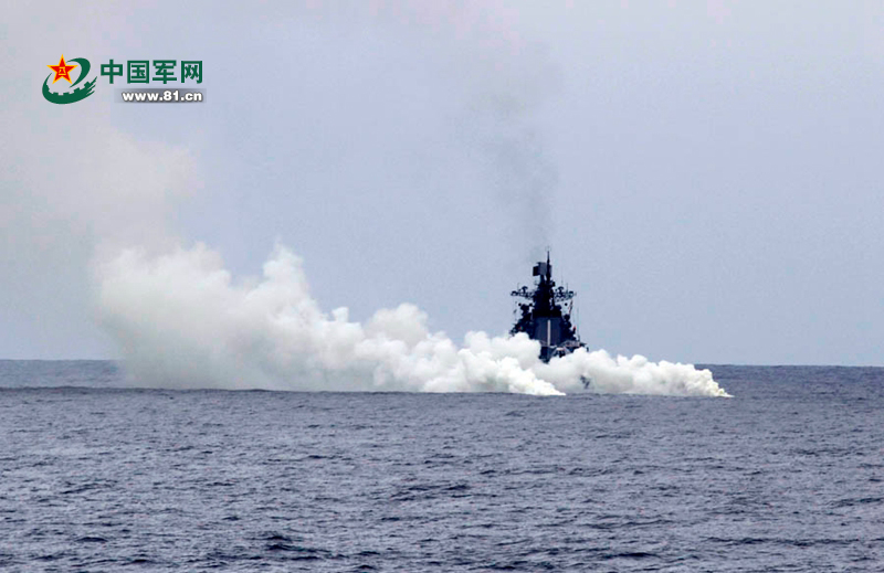 俄“快速”号驱逐舰施放烟幕。王志鹏摄