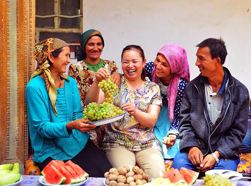 45岁的汉族女企业家尤良英(中)与皮山县维吾尔族农民麦麦体图如普·穆萨克(右一)结下十年姐弟情谊,用超越民族和血缘的奉献,手把手帮助其走上了致富的道路。 (9月3日摄)。新华社记者 马锴 摄