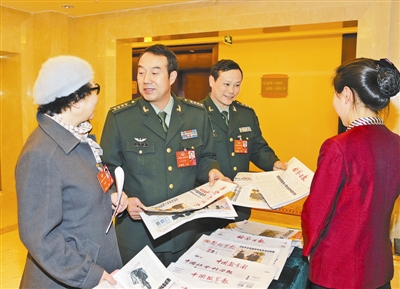 3月1日,出席全国政协十二届四次会议的政协委员陆续向大会报到。图为军队政协委员江汉刚(左二)、徐洪刚(左三)向大会报到后选读当日报纸。本报记者 穆可双摄
