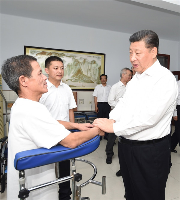 7月28日,中共中央总书记、国家主席、中央军委主席习近平到河北唐山市调研考察。这是习近平在唐山市截瘫疗养院康复室了解截瘫伤员的康复治疗情况。新华社记者 谢环驰 摄