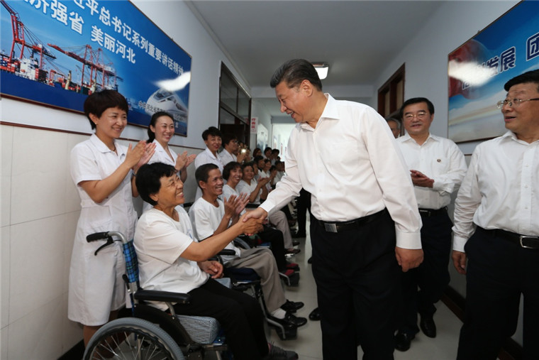 7月28日,中共中央总书记、国家主席、中央军委主席习近平到河北唐山市调研考察。这是习近平在唐山市截瘫疗养院看望慰问截瘫伤员。新华社记者 兰红光 摄