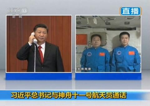 习近平:你们已经在太空生活了半个多月,海鹏同志是第三次执行载人航天任务,陈冬同志是第一次进入太空,全国人民都很关心你们。你们现在身体状况怎么样?生活怎么样?你们的工作进展得顺利吗?