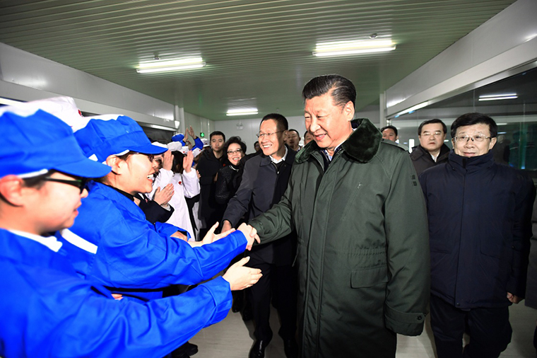1月24日,中共中央总书记、国家主席、中央军委主席习近平来到河北省张家口市,看望慰问基层干部群众,考察脱贫攻坚工作。这是习近平在张家口市察北管理区的旗帜婴儿乳品有限公司向职工拜年。 新华社记者 李涛摄