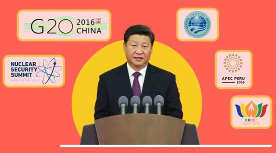 2016年,习近平出席了五场国际峰会(联合国核安全峰会、上合组织峰会、二十国集团峰会、金砖峰会、亚太经合组织峰会),为世界安全、全球治理,阐述“中国方案”,贡献“中国智慧”。
