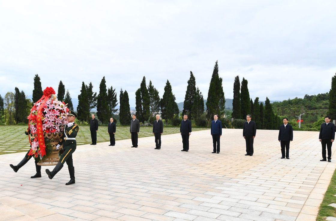4月25日至27日,中共中央总书记、国家主席、中央军委主席习近平在广西考察。这是25日上午,习近平在位于桂林市全州县的红军长征湘江战役纪念园,向湘江战役红军烈士敬献花篮。新华社记者 谢环驰 摄
