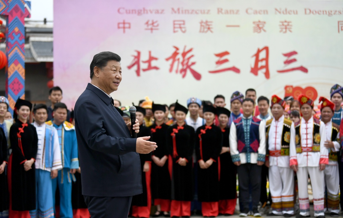 广西是我国少数民族人口最多的自治区。27日上午,习近平来到位于南宁市邕江之畔的广西民族博物馆,参观壮族文化展。博物馆外,三月三“歌圩节”壮族对歌等民族文化活动正在这里集中展示。习近平强调,广西是全国民族团结进步示范区,要继续发挥好示范带动作用。各民族共同团结进步、共同繁荣发展是中华民族的生命所在、力量所在、希望所在,在全面建设社会主义现代化国家的新征程上,一个民族都不能少,各族人民要心手相牵、团结奋进,共创中华民族的美好未来,共享民族复兴的伟大荣光。