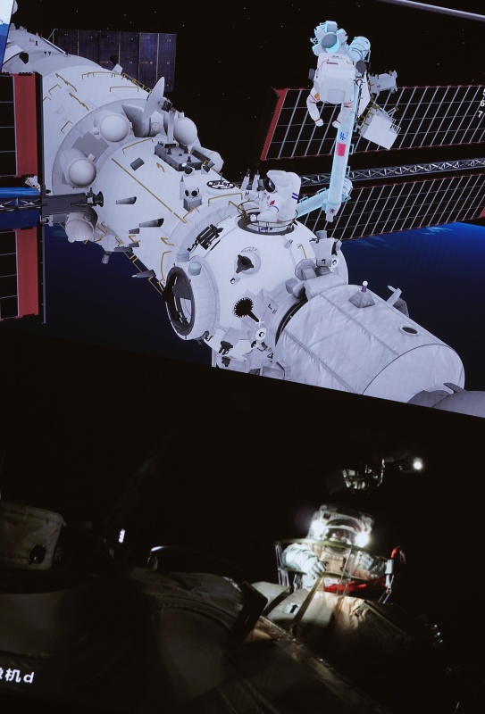 8月20日在北京航天飞行控制中心大屏拍摄的神舟十二号乘组航天员在舱外工作场面。新华社记者 田定宇 摄
